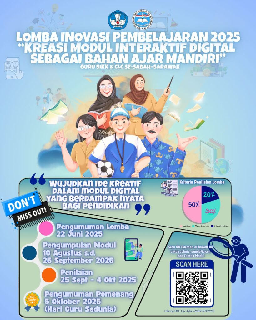 LOMBA INOBEL 2025 RESMI DIBUKA! 🎯 Kreasi Modul Interaktif Digital sebagai Bahan Ajar Mandiri 👩🏫 Untuk guru SIKK & CLC se-Sabah–Sarawak 📲 Scan QR di poster atau klik link di bio untuk: ✅ Juknis ✅ Link pendaftaran ✅ Surat pernyataan ✅ Contoh modul atau klik lewat tautan berikut https://sites.google.com/view/inobel-2025 💡 Yuk, wujudkan ide kreatifmu dalam […]